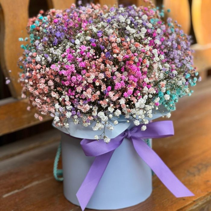 Лента атласная – 1 шт. Шляпная коробка – 1 шт. Оазис флористический – 1 шт. гипсофила радужная – 7 шт.
