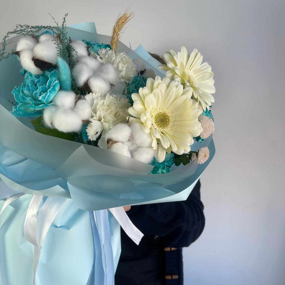 Гербера – 2 шт.Диантус – 8 шт.Хлопок натуральный – 6 шт.Салал пучок – 1 шт.Колосок – 1 шт.Пленка – 6 шт.