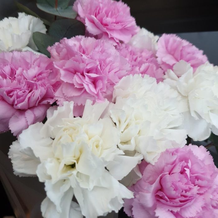 Букет с диантусами и эвкалиптом