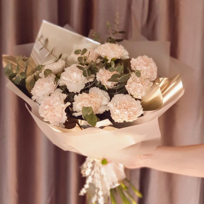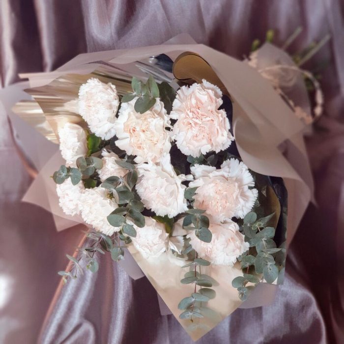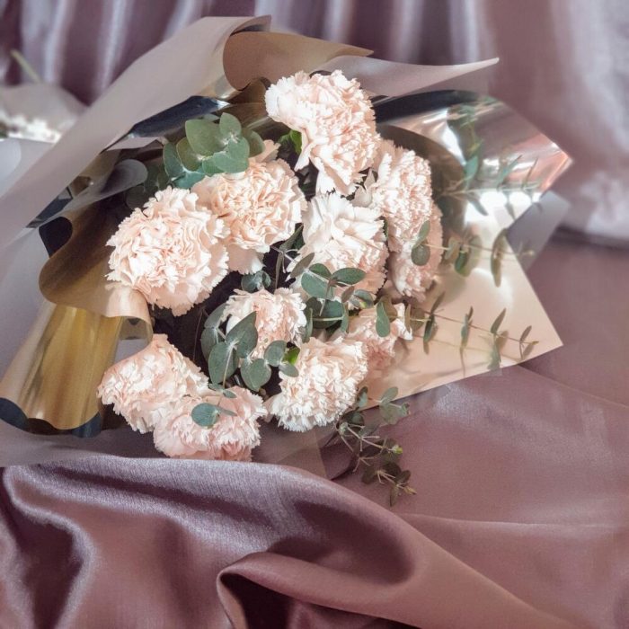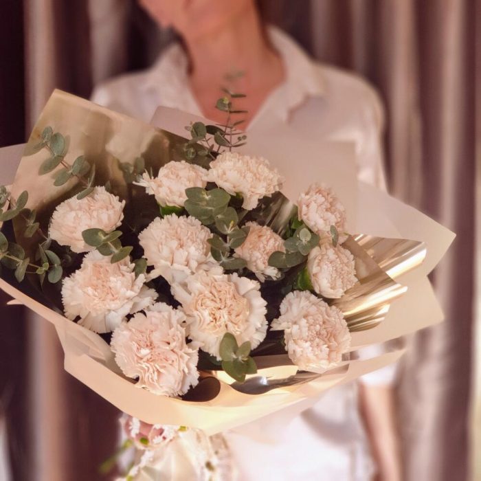 Эвкалипт – 3 шт.Пленка матовая – 2 шт.Открыточка с вашими пожеланиями – 1 шт.диантус кремовый импорт – 11 шт.тишью фольгированное – 2 шт.тесьма кружево кремовая – 1 шт.