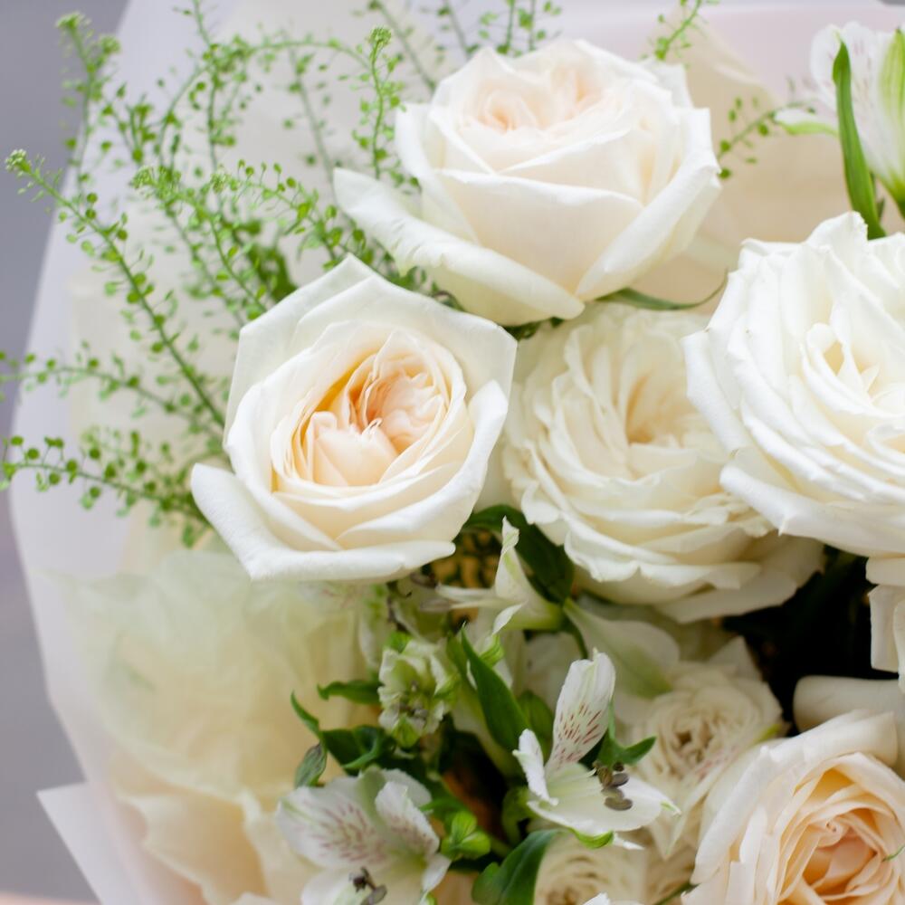 Альстромерия – 2 шт.Роза кустовая – 1 шт.Роза пионовидная – 5 шт.Гринбелл – 1 шт.Упаковка дизайнерская – 1 шт.