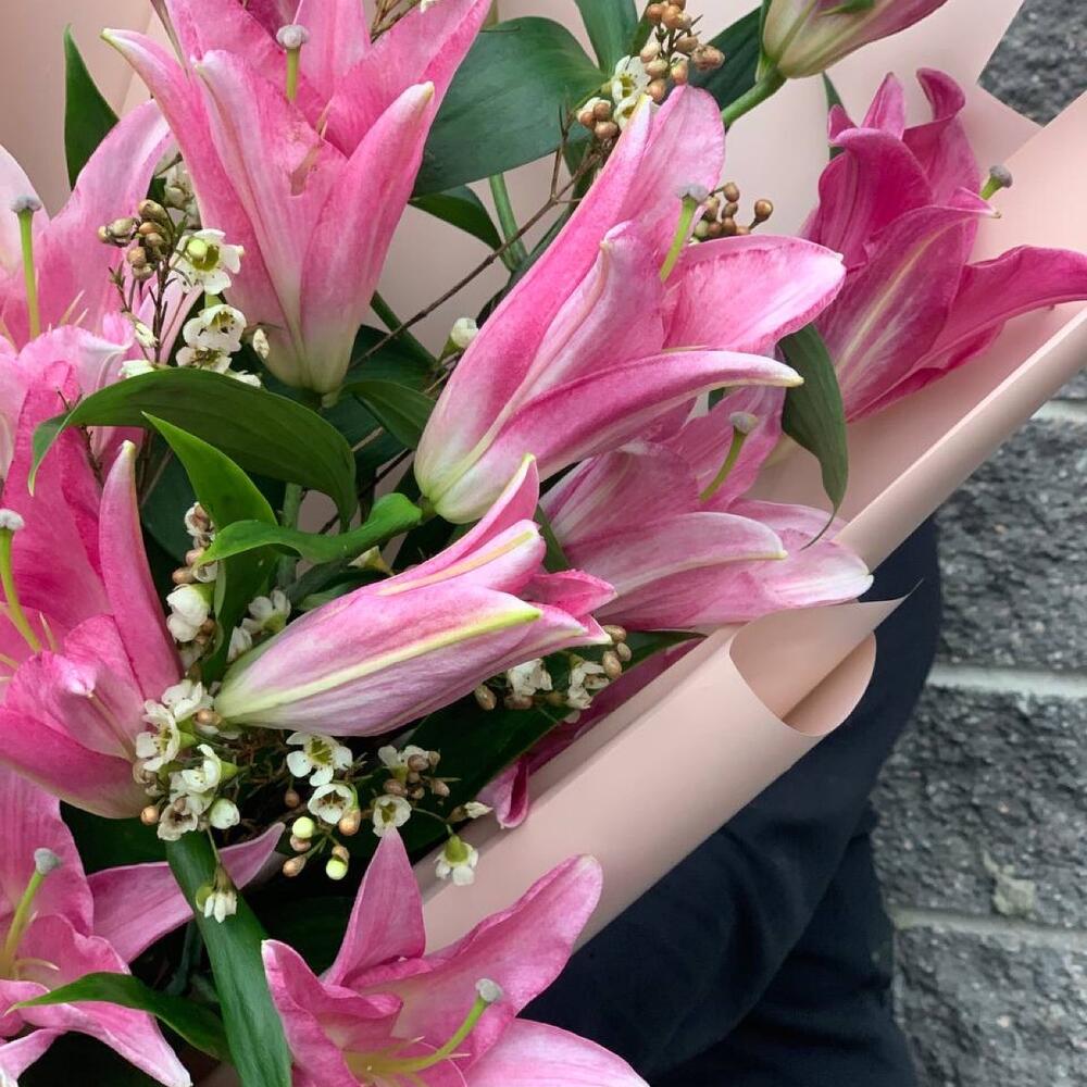 Лилия розовая – 3 шт.Ваксфлауэр – 1 шт.Упаковка дизайнерская – 2 шт.Лента атласная – 1 шт.