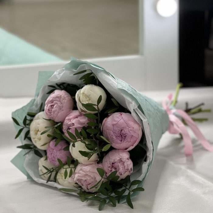 Пион – 11 шт.Дизайнерская упаковка – 1 шт.Атласная лента – 1 шт.открыточка – 1 шт.