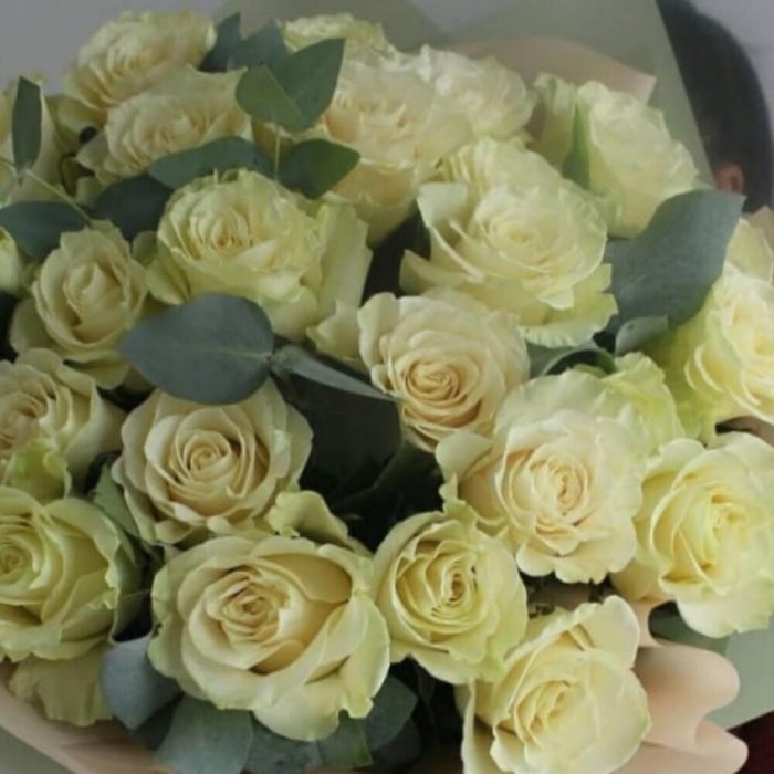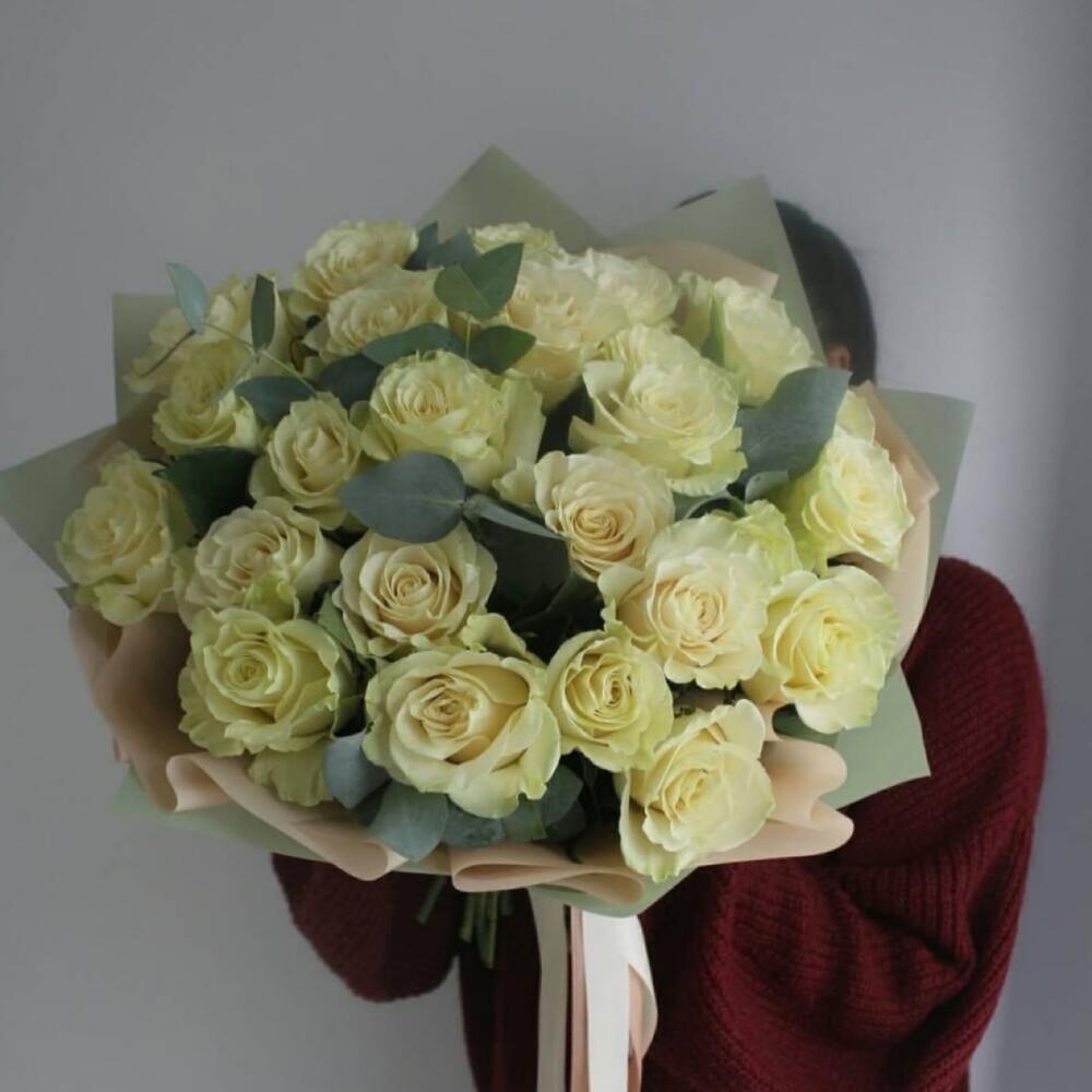 25 белых роз с шикарным эвкалиптом