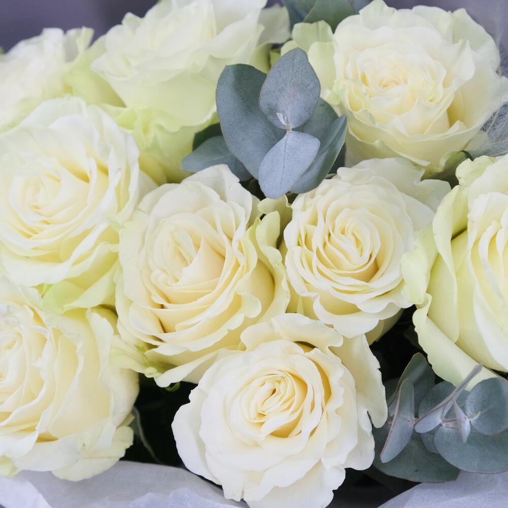 9 белых роз Мондиаль с эвкалиптом