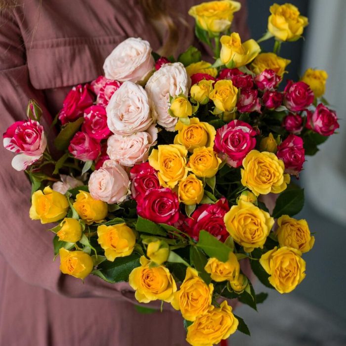 кустовая роза микс – 9 шт.Лента атласная – 1 шт.