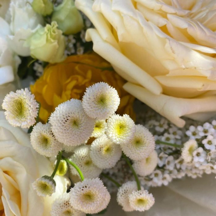 кэндллайт роза – 3 шт.Маттиола – 3 шт.Фрезия – 2 шт.эустома алиса вайт – 1 шт.матрикарья – 2 шт.Тюльпан пионовидный – 3 шт.ветви малины – 3 шт.спирея ветка – 2 шт.Упаковка дизайнерская – 3 шт.Лента атласная – 1 шт.