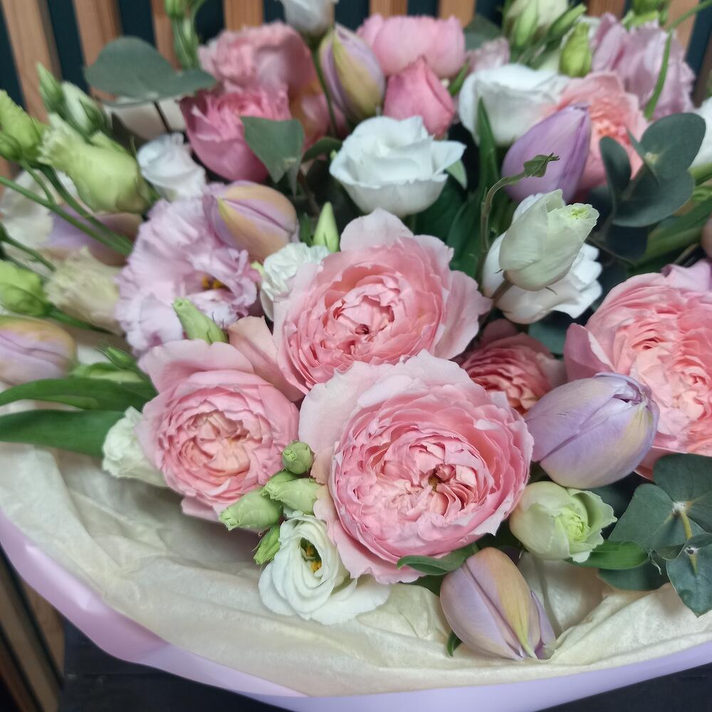 Категорий: Кустовые розы, Лизиантусы, Пионовидные розы, Розы, Тюльпаны