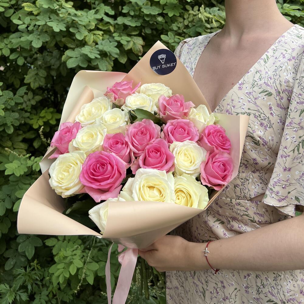белая роза – 10 шт.Розовая роза – 11 шт.пленка цветная – 2 шт.Лента атласная – 1 шт.
