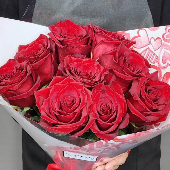 Лента атласная – 1 шт.Упаковка дизайнерская – 1 шт.Роза одноголовая эквадор – 9 шт.