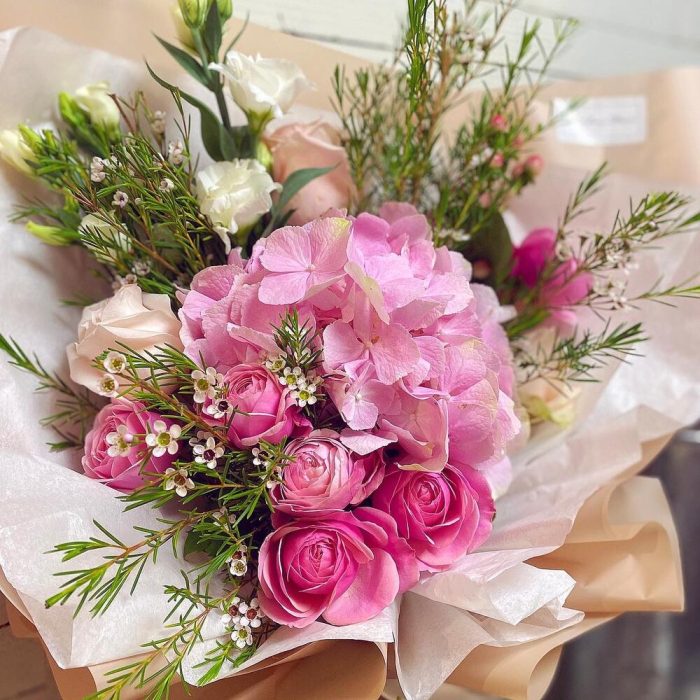 Альстромерии, Гортензии, Кустовые розы, Лизиантусы, Розы, Хризантемы