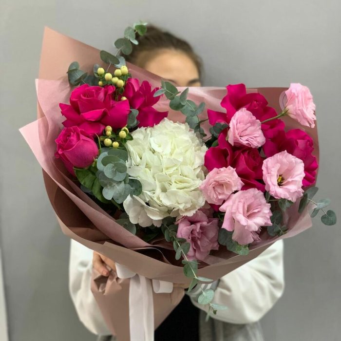 Гвоздики, Лизиантусы, Розы, Тюльпаны