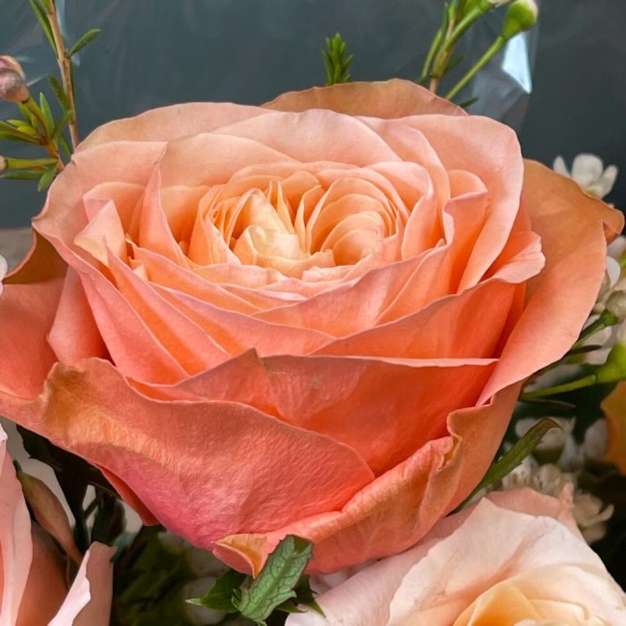 Ваксфлауэр – 2 шт.Лента – 1 шт.Эвкалипт – 2 шт.Роза одноголовая – 11 шт.Упаковка дизайнерская – 1 шт.