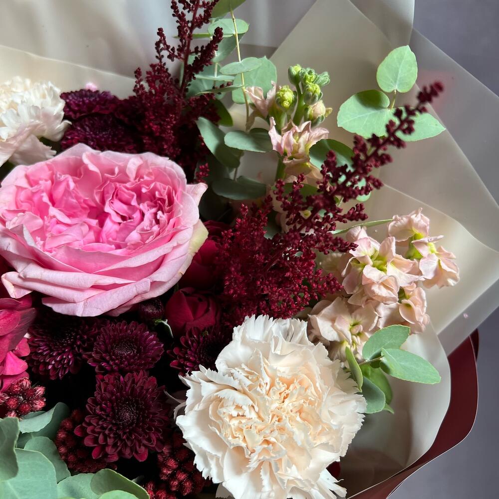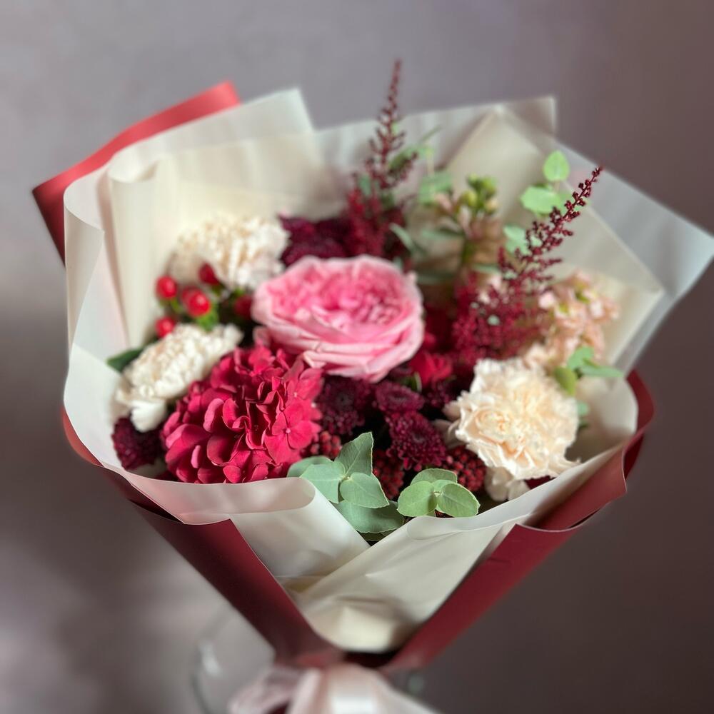 Астильба – 2 шт.Гиперикум – 1 шт.Маттиола – 2 шт.Эвкалипт – 1 шт.Сантини – 3 шт.Пионовидная роза – 1 шт.Атласная лента – 1 шт.Капс – 1 шт.Гортензия мини – 1 шт.декоративная упаковка – 1 шт.диантусы сортовые – 3 шт.