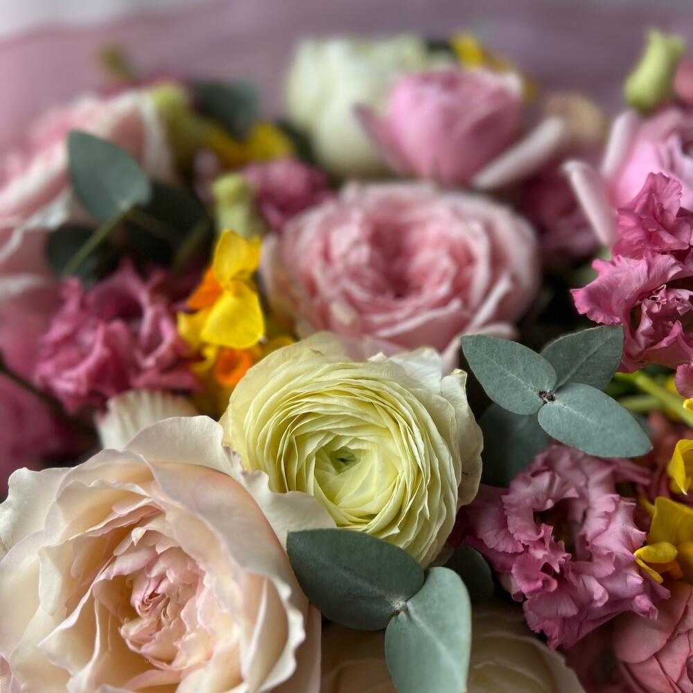 Букет с пионовидной садовой розой и ранункулюсами