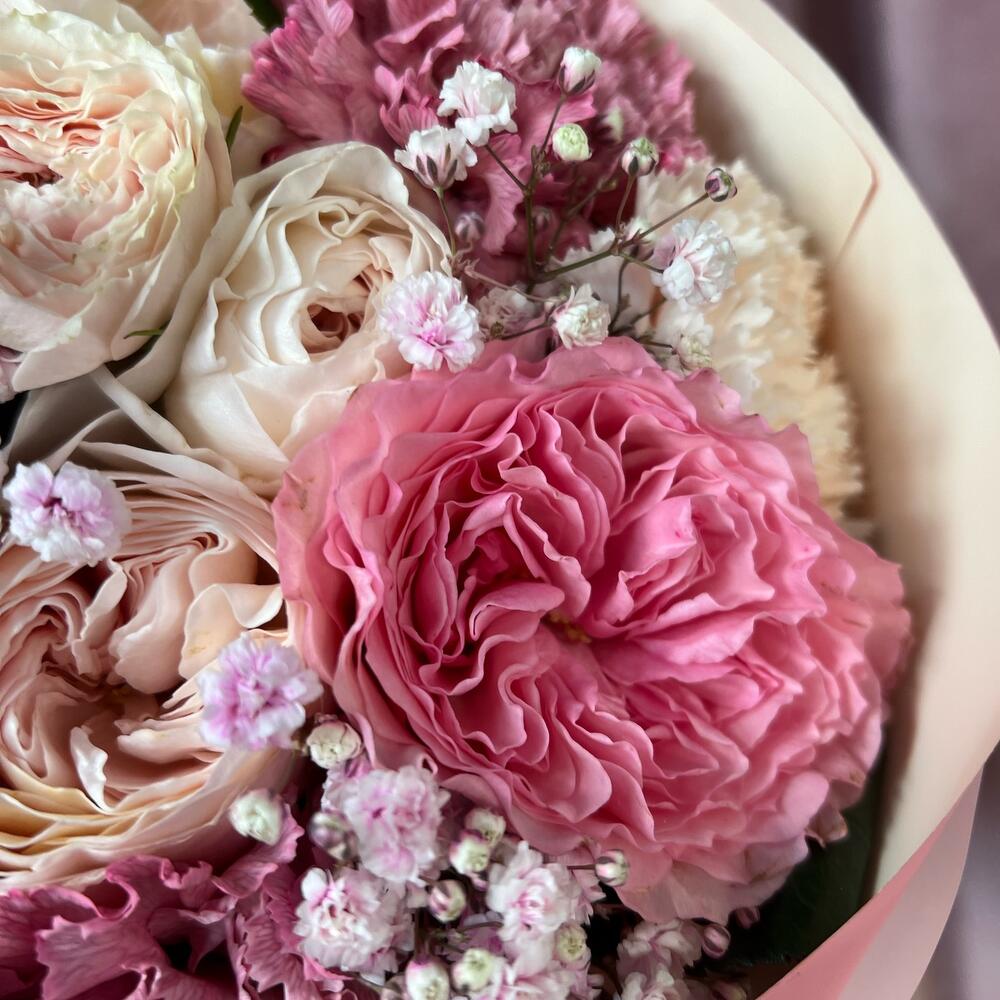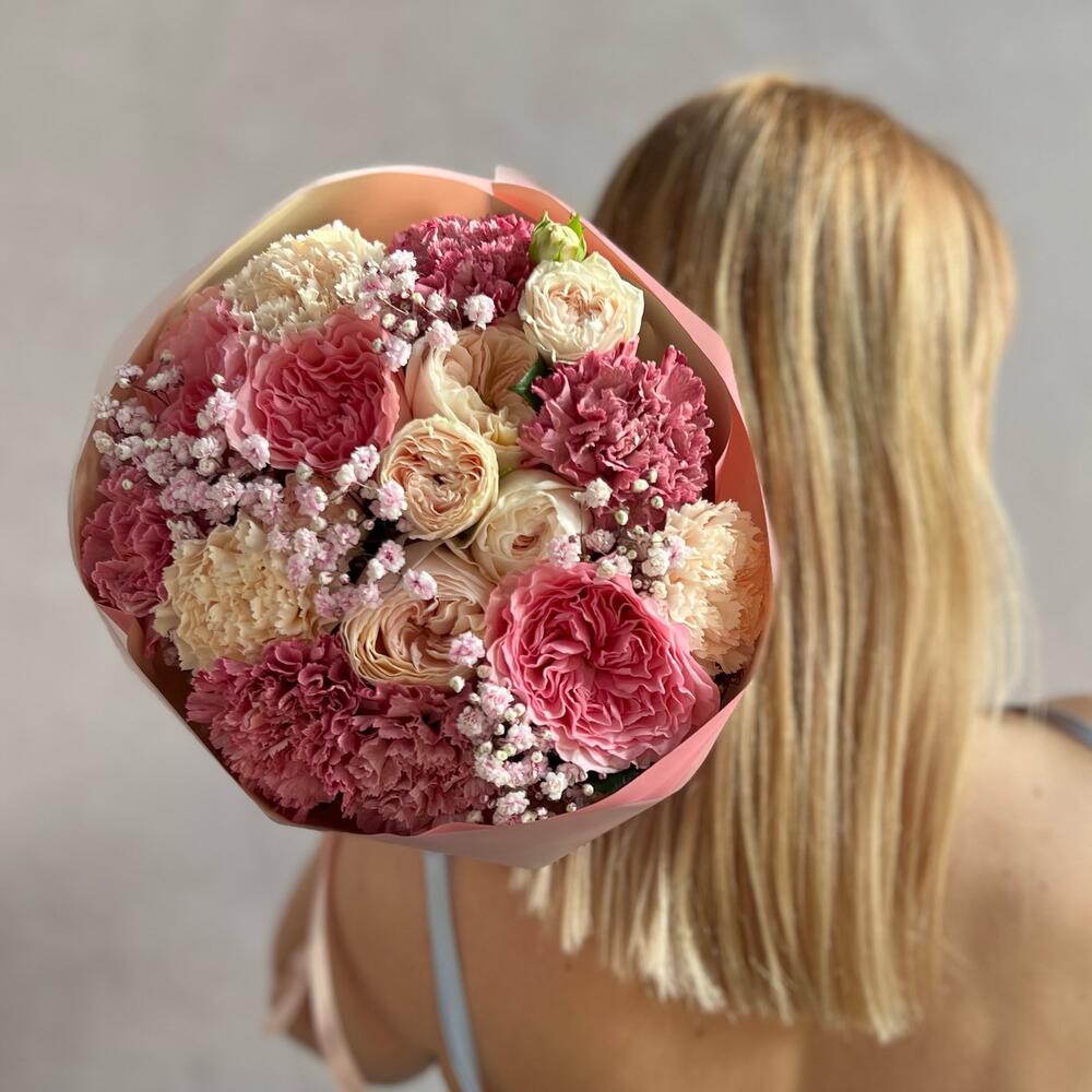 Диантус – 8 шт.Кустовая пионовидная роза – 1 шт.Пионовидная роза – 6 шт.Гипсофила – 2 шт.декоративная упаковка – 1 шт.Атласная лента – 1 шт.