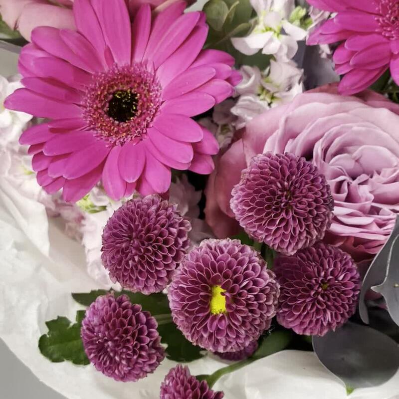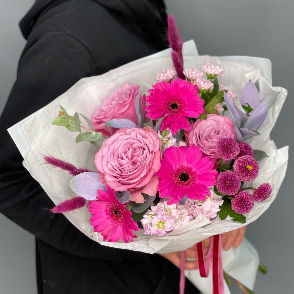 Маттиола – 3 шт.Рускус – 3 шт.Хризантема Сантини – 2 шт.Эвкалипт – 1 шт.Роза одноголовая – 3 шт.Лента атласная – 1 шт.Гербера мини – 3 шт.Упаковка дизайнерская – 1 шт.Лагурус – 7 шт.