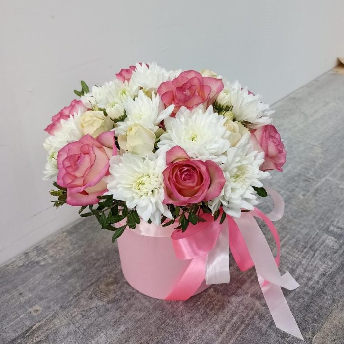 “Атлас☁️” – цветочная композиция с зефиром в деревянном ящике