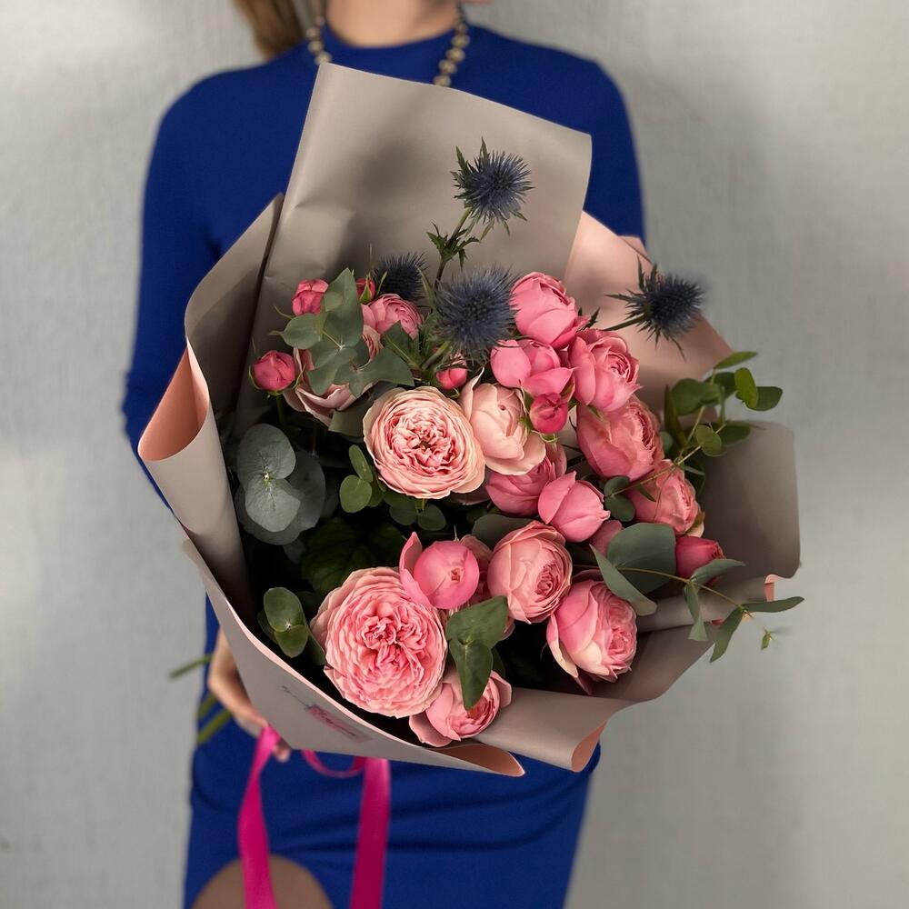 Альстромерии, Гвоздики, Кустовые розы, Лизиантусы, Розы, Хризантемы