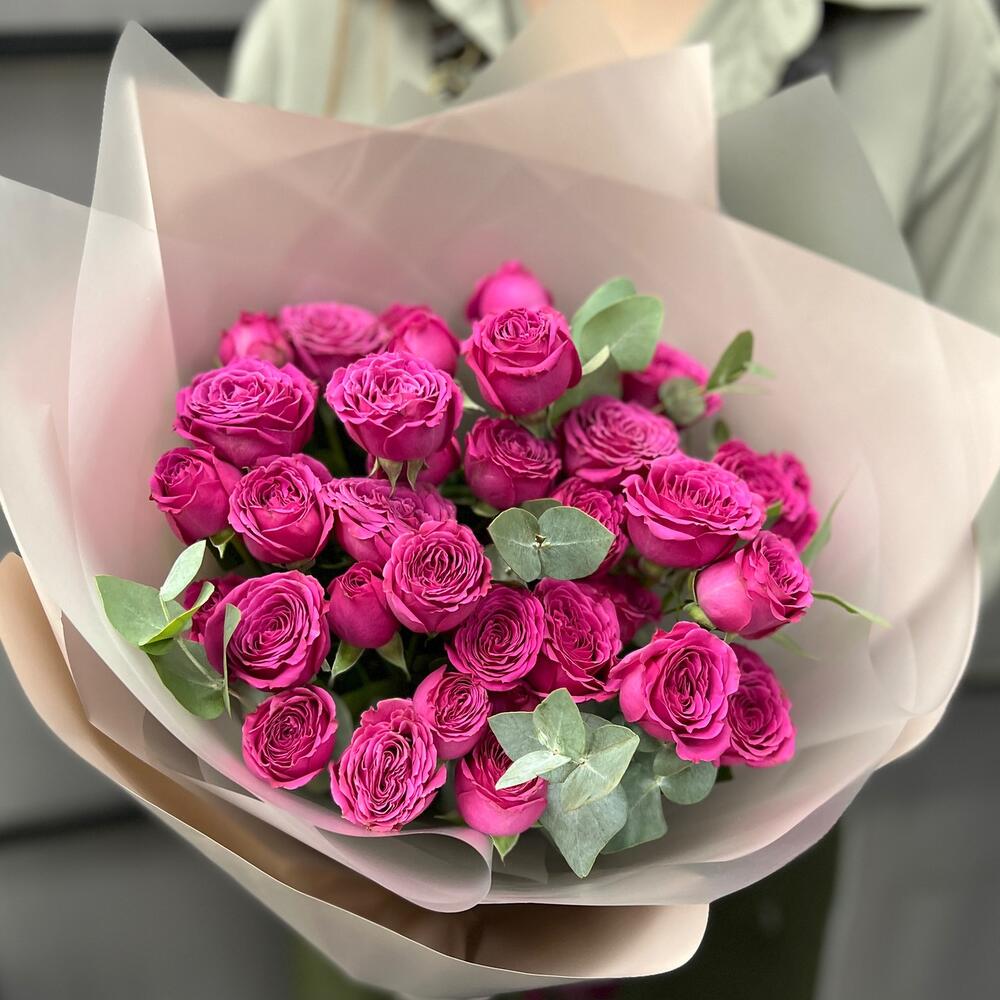 роза кустовая классик сенсейшн – 7 шт.Эвкалипт – 3 шт.Пленка матовая – 5 шт.Лента атласная – 2 шт.