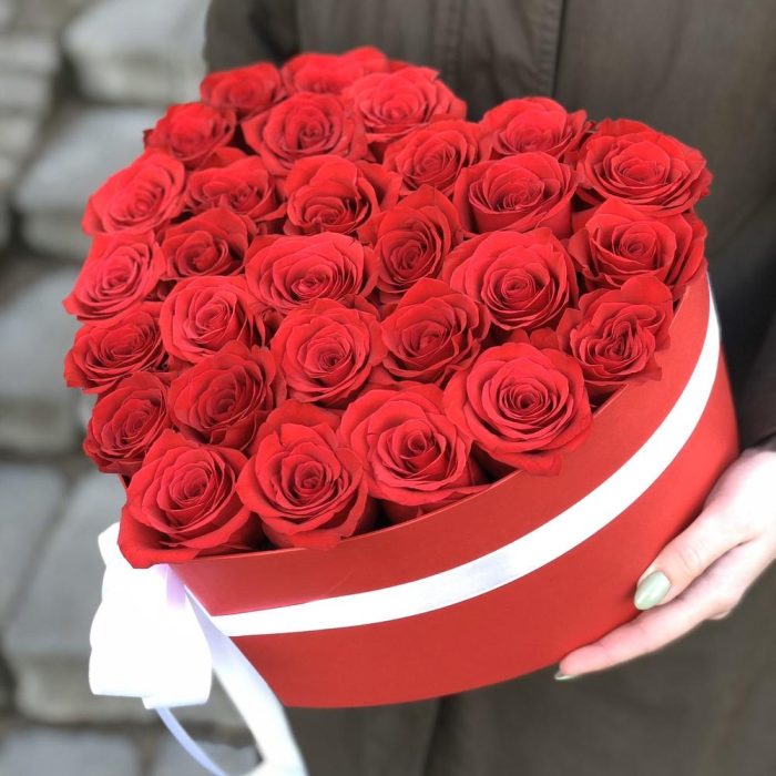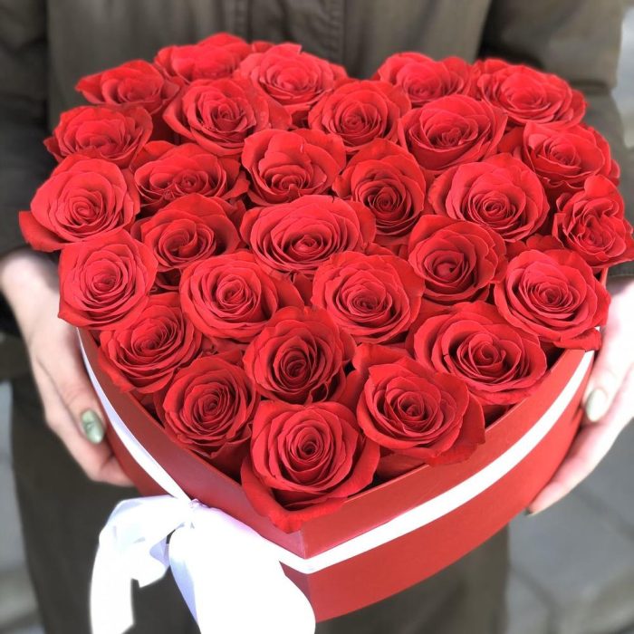 Роза красная – 29 шт. Коробка сердце – 1 шт. атласный бант – 1 шт. Оазис – 2 шт.