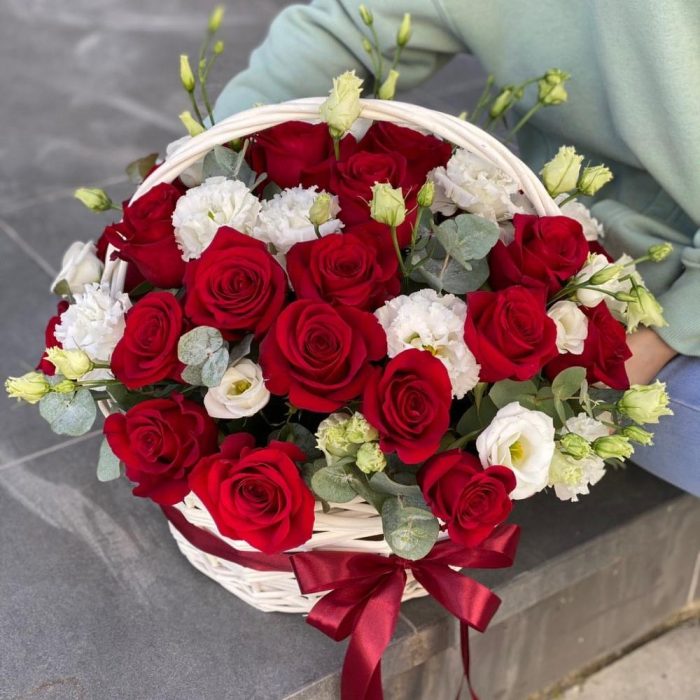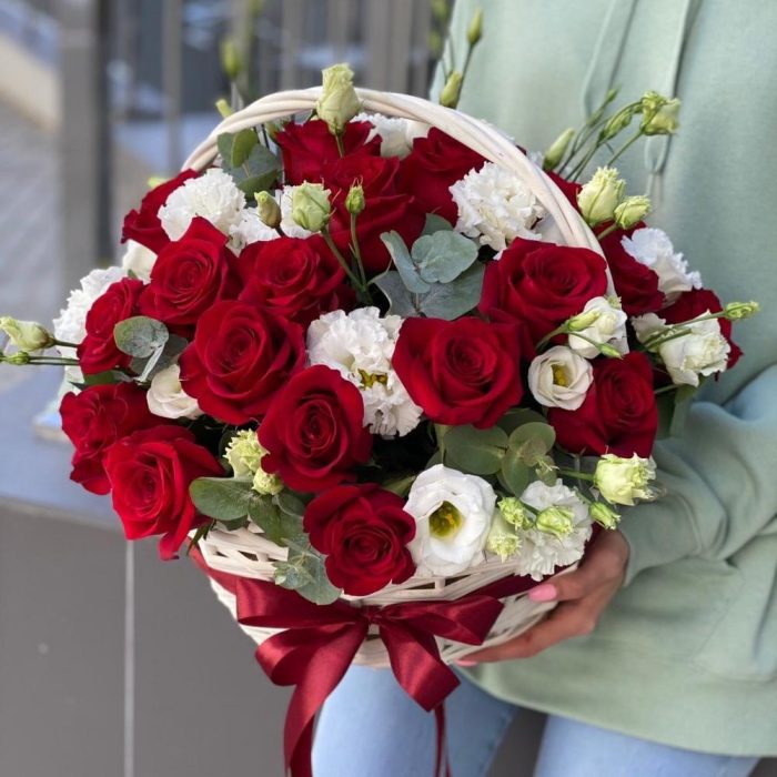 красная роза фридом – 29 шт. Эустома – 6 шт. Эвкалипт – 3 шт. Оазис – 4 шт. Оформление – 1 шт. Корзина – 1 шт.