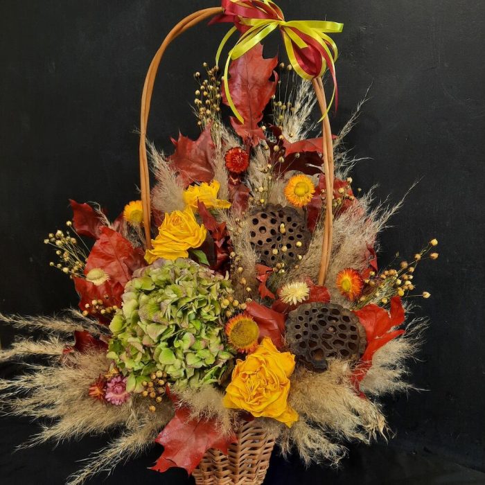 Роза – 3 шт.Лента атласная – 4 шт.Корзина плетеная – 1 шт.Лотос сухой – 2 шт.Оазис флористический – 1 шт.Гелихризум – 15 шт.Дубовые листья – 5 шт.кортадерия – 3 шт.лен пучок – 1 шт.