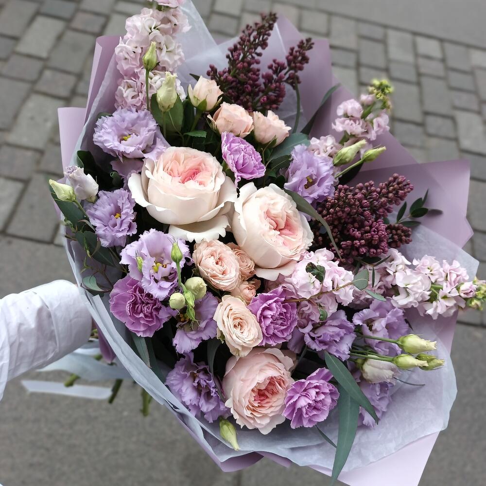 Лавандовый раф с сиренью,пион розами,маттиолой,диантусами и эустомой