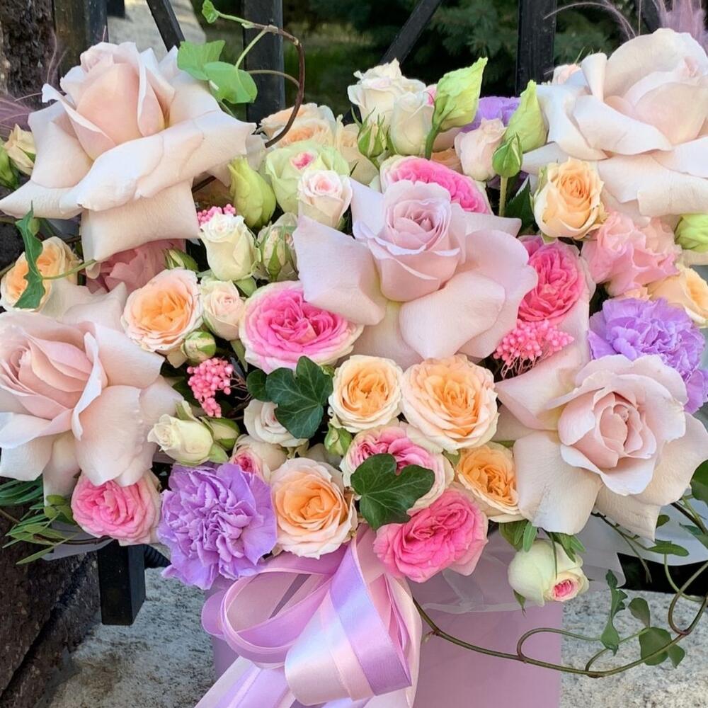 Роза кустовая – 5 шт.Лента атласная – 2 шт.Коробка шляпная – 1 шт.Гвоздика лунная – 3 шт.Роза французская – 5 шт.эустома белая – 3 шт.