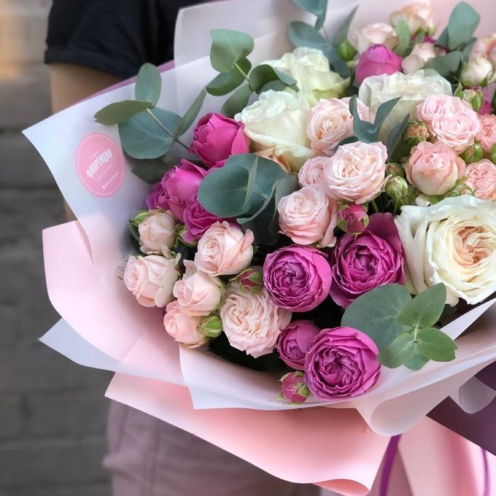 роза кустовая пионовидная misty bubbles – 5 шт.роза кустовая пионовидная bombastic – 9 шт.роза одноголовая пионовидная white o’hara – 5 шт.Зелень – 4 шт.Упаковка дизайнерская – 3 шт.