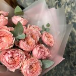 mono bouquet 145 из 5 кустовых пионовидных роз сорта Julietta с эвкалиптом