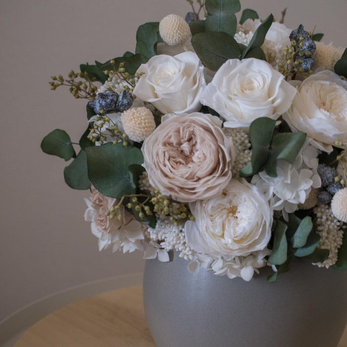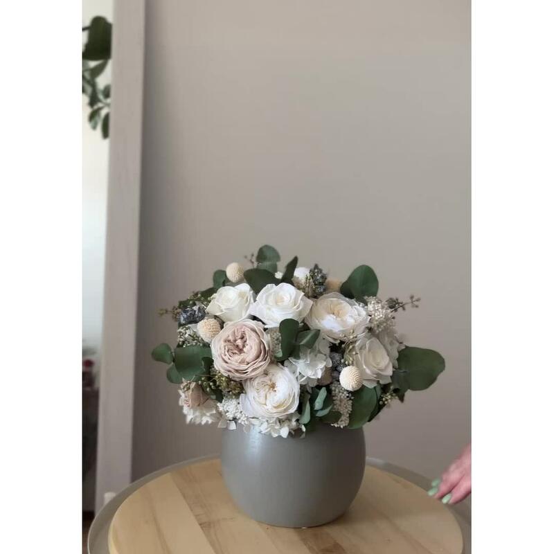 Роза стабилизированная – 15 шт.Эвкалипт стабилизированный – 16 шт.гортензия стабилизированная – 1 шт.озотамнус стабилизированный – 1 шт.эвкалипт плоды – 9 шт.