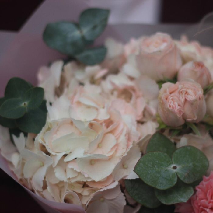 Рускус – 5 шт.Эвкалипт – 4 шт.Лента атласная – 1 шт.Кустовая роза Бомбастик – 2 шт.Гортензия розовая – 1 шт.Диантус розовый – 3 шт.Дизайнерская упаковка – 5 шт.стифа натуральная – 1 шт.