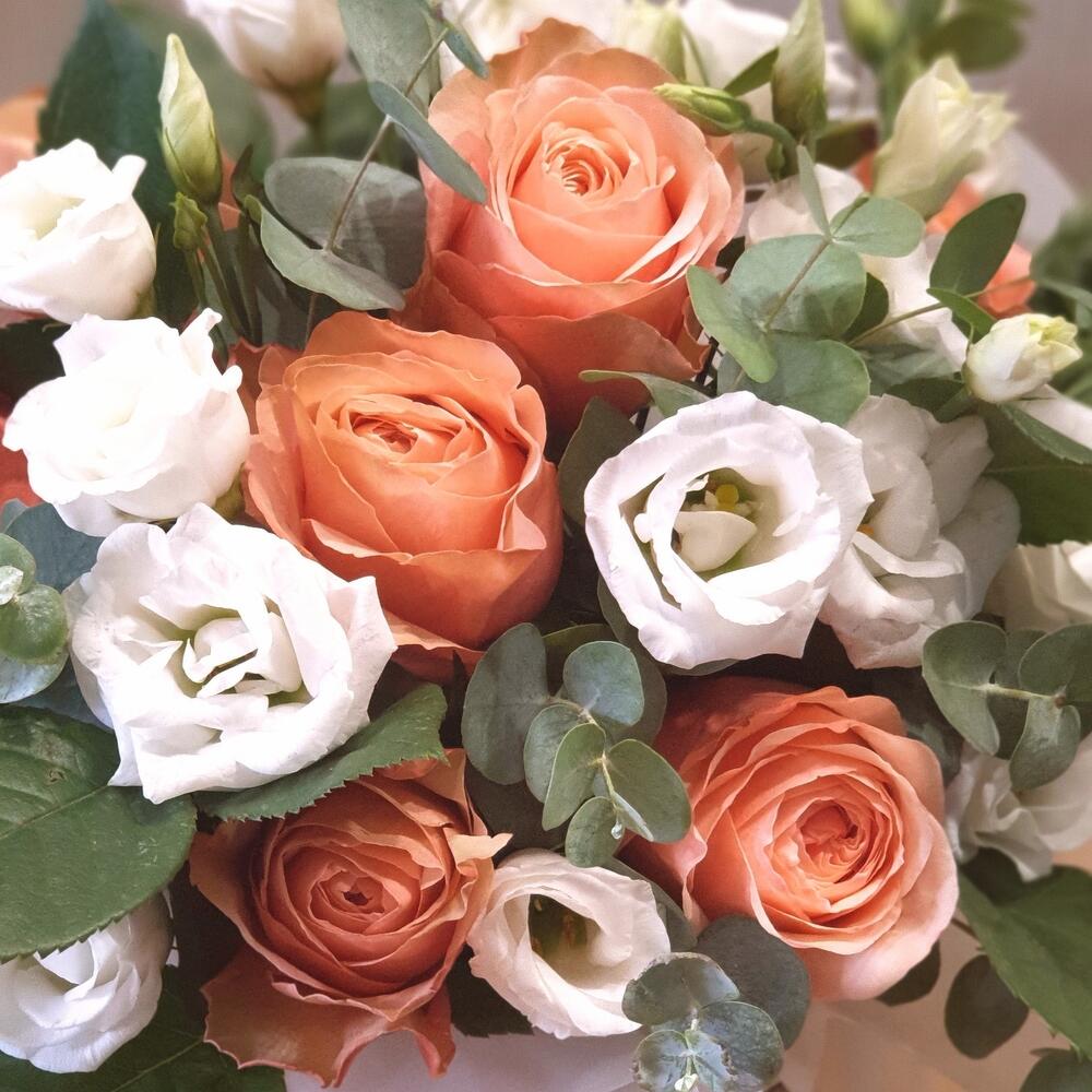 Роза Капучино – 3 шт.Эвкалипт – 3 шт.Лента атласная – 2 шт.Лизиантус белый – 5 шт.Открыточка с вашими пожеланиями – 1 шт.Оазис флористический – 1 шт.коробка шляпная крафт – 1 шт.