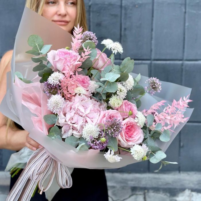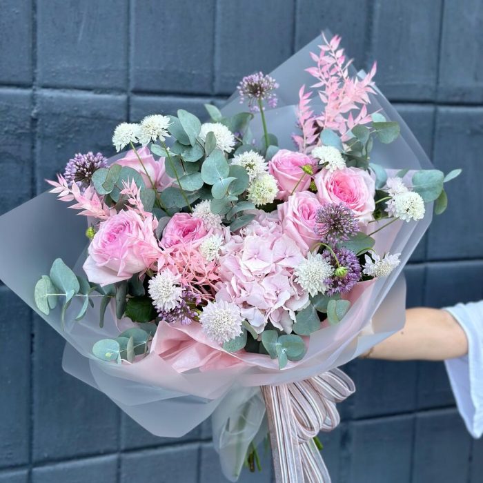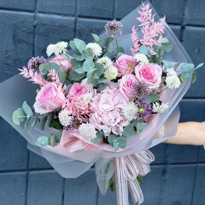 “Эвкалиптическая роскошь” гортензия и пионовидная кустовая роза