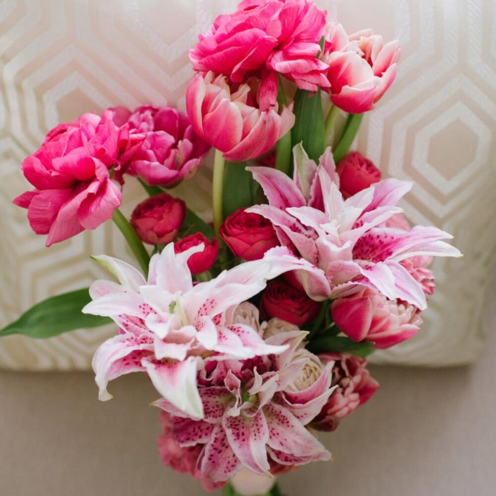 Лента – 1 шт.Диантус – 3 шт.Ранункулюс – 2 шт.Тюльпан пионовидный – 5 шт.Ваза – 1 шт.Сумка-переноска – 1 шт.Роза кустовая жанин – 1 шт.лилия пионовидная – 3 шт.роза кустовая джульетта церайз – 2 шт.
