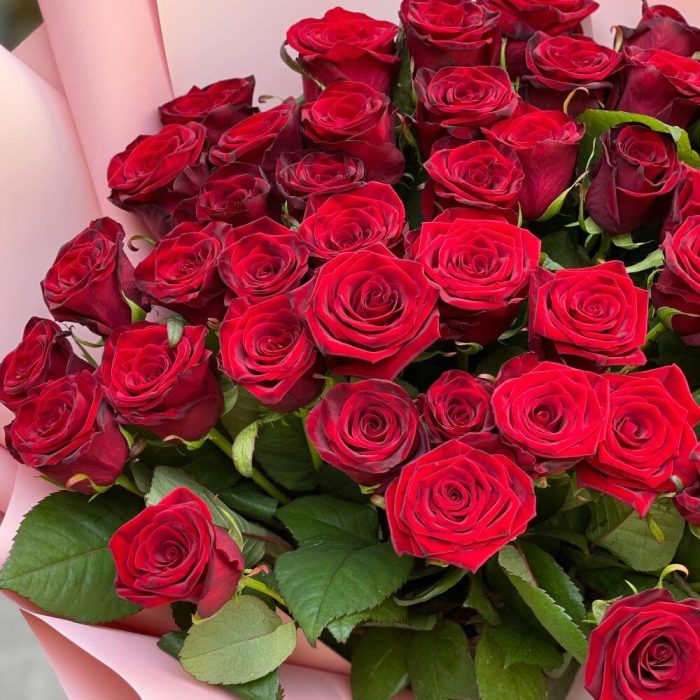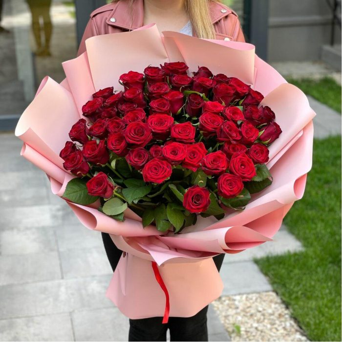 Роза красная – 51 шт. Атласная лента – 1 шт. Современная упаковка – 1 шт.