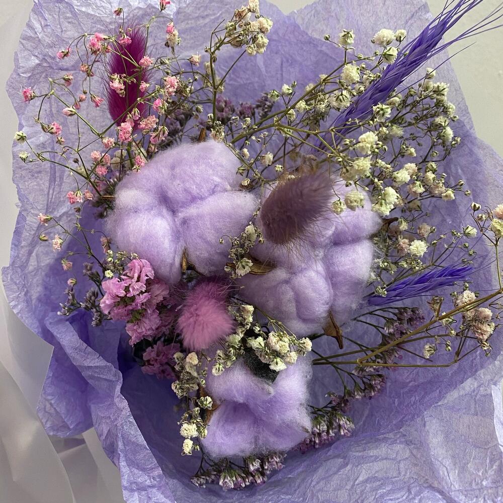 «Лавандовое созвездие» Букет из розы, гвоздики, статица и хлопка