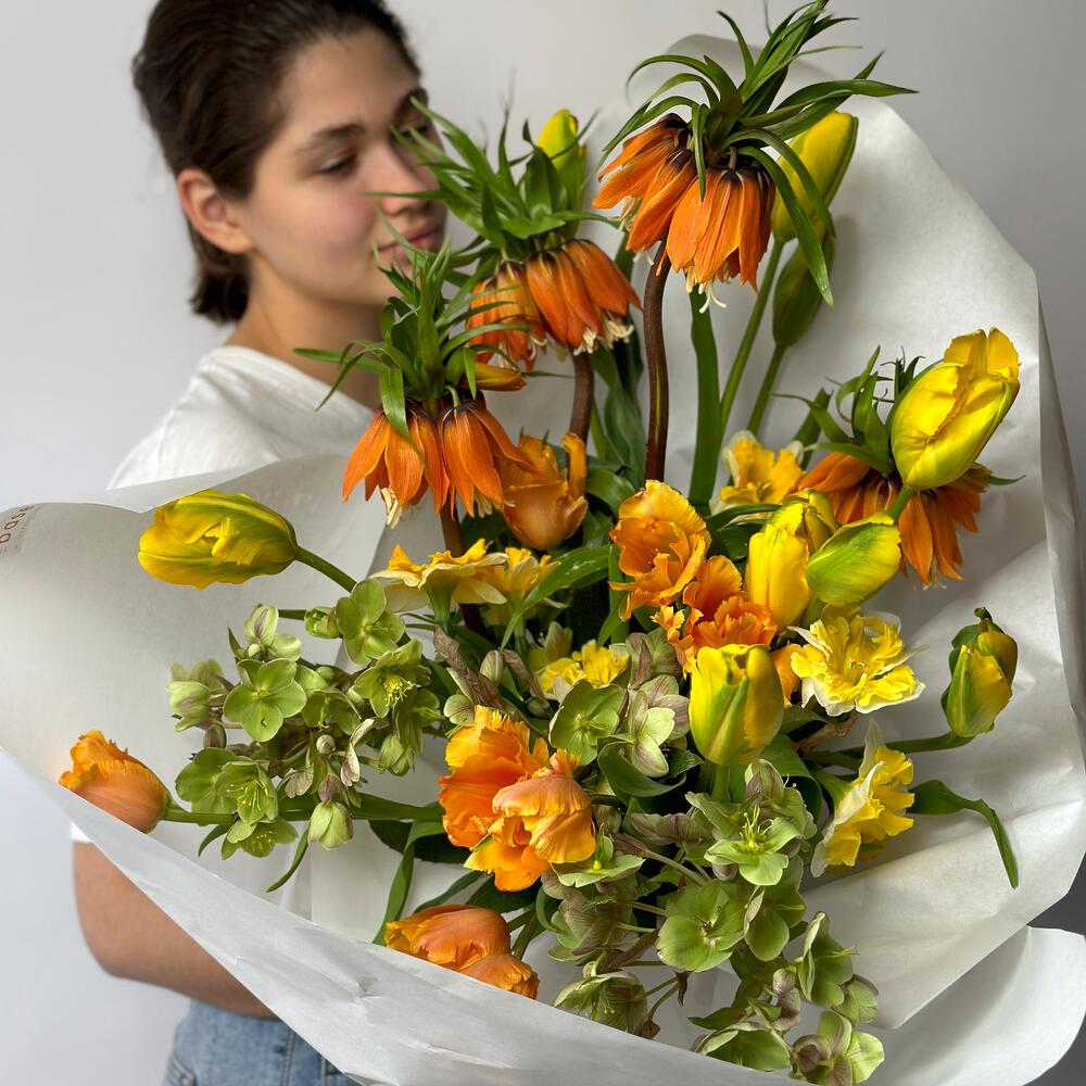 рябчик – 4 шт.Тюльпан желтый – 10 шт.Тюльпан оранжевый – 8 шт.Хелеборус – 3 шт.Нарцисс – 10 шт.