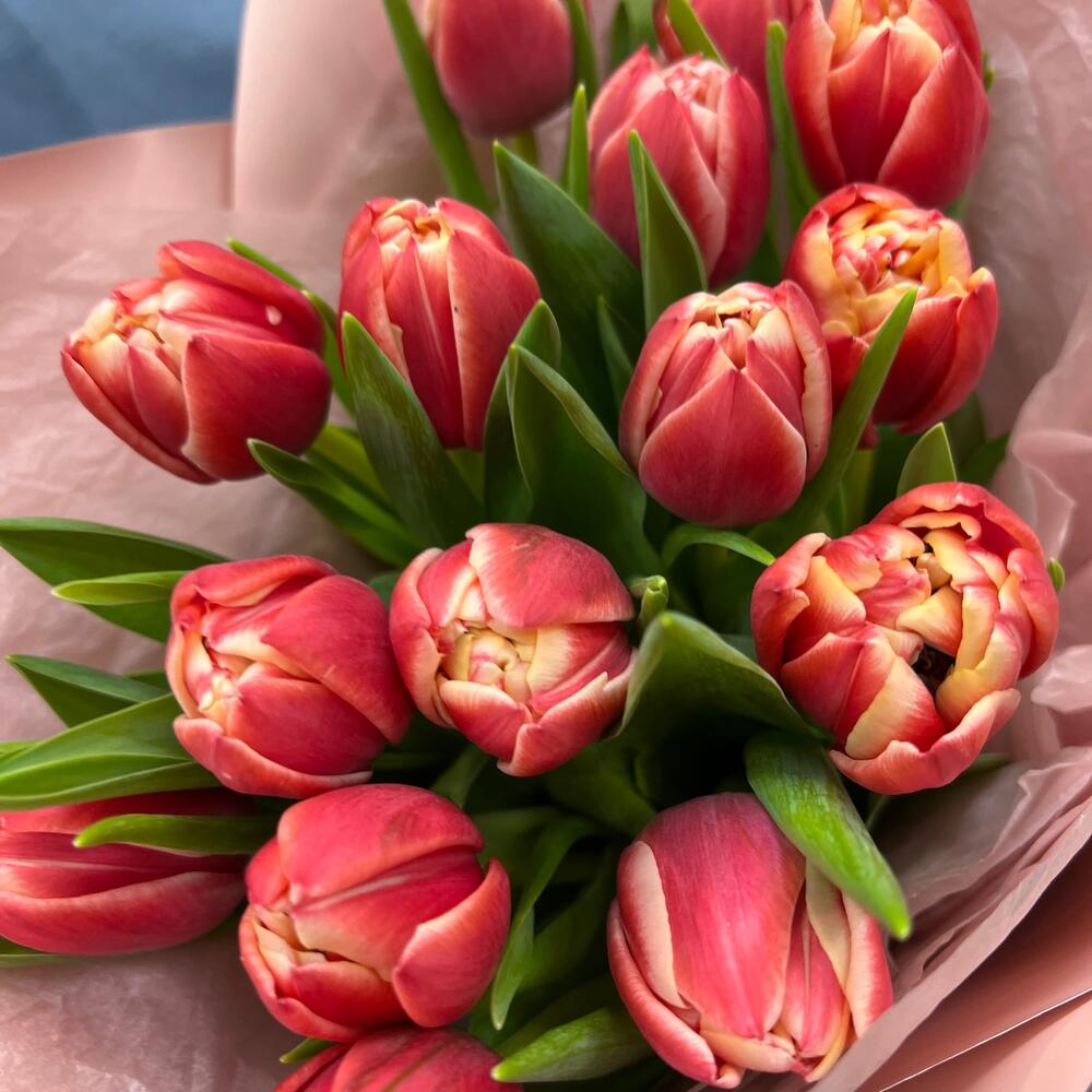 Тюльпан пионовидный – 15 шт.Тишью – 2 шт.Пленка матовая – 2 шт.Лента атласная – 2 шт.